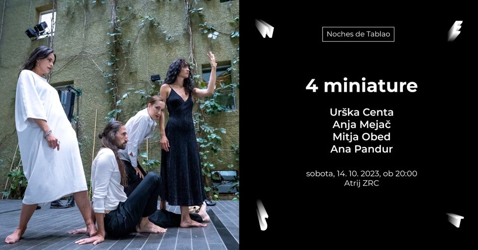 V 4 miniaturah se srečujejo kot štirje ustvarjalci, ki na istem kraju in ob istem času pripravljajo vsak svoje, izvirno in za dogodek zasnovano koreografsko miniaturo. V njih prestopajo meje lastnega kreativnega medija, se sprehajajo po robu definicij žanra in formata ter iščejo nove kombinacije in kontekste odrskega sobivanja z drugimi performerji. Njihovo aktualno delo aktivno sega tudi na področje glasbe, odpira vprašanja o razmerju med plesnim telesom in zvokom ter prežemanjih koreografije sodobnega flamenka z okoljem, v katerem bivajo. Tako se srečujejo v razumevanju plesa flamenka kot zvočila ter razmisleku in uporabi gibajočega telesa kot zvočnega inštrumenta.